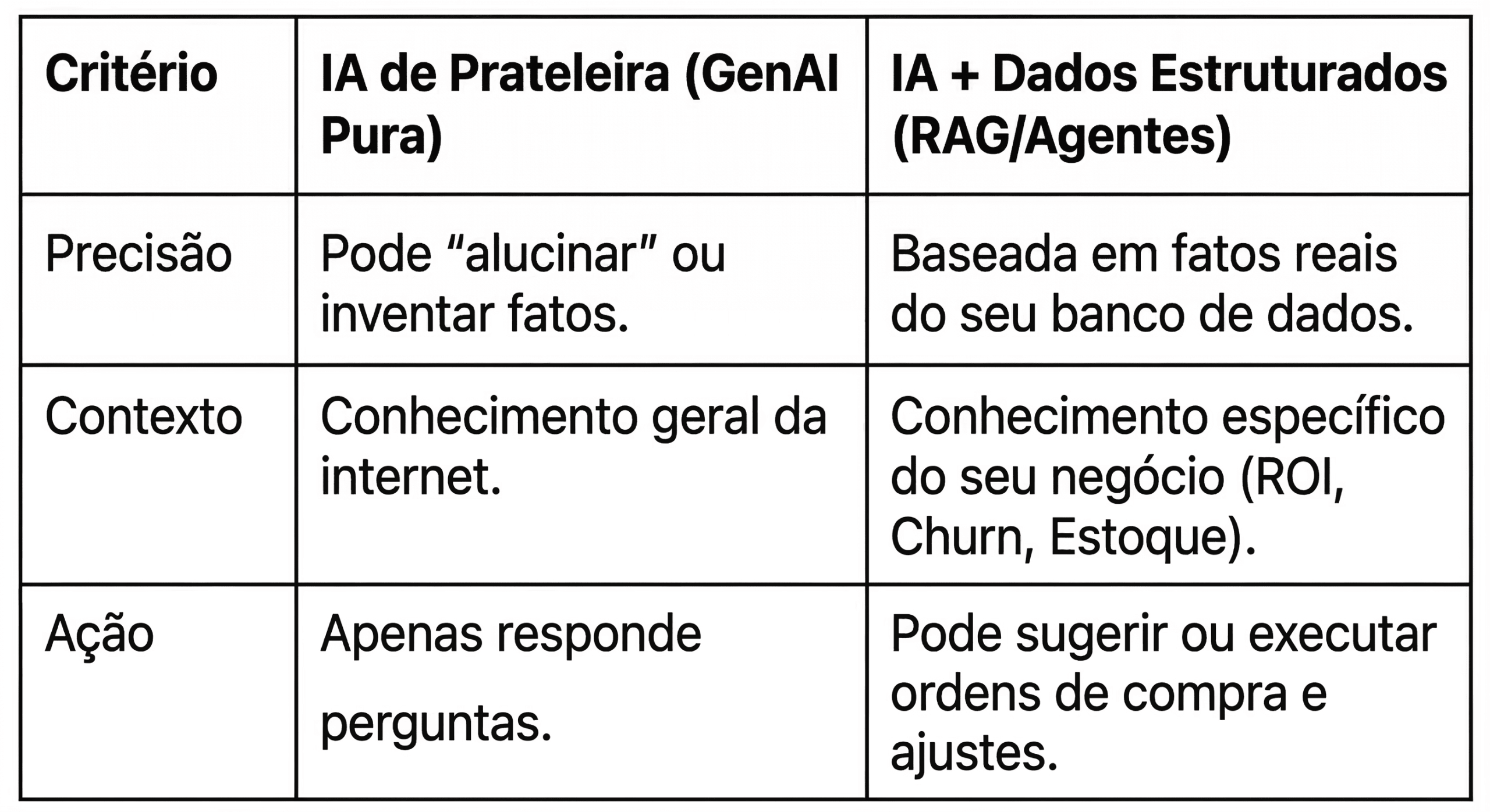 Em resumo, somar IA com Dados significa passar de uma ferramenta que ajuda a pensar para um sistema que ajuda a operar. É a transição da IA como um “copiloto” para a IA como um “membro da equipe” capaz de executar processos complexos com base na realidade imediata da empresa.